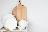 Zestaw przyborów kuchennych w stojaku na kamiennym stole w pobliżu lekkiej ściany. Miejsce na tekst