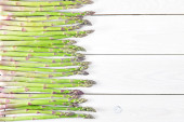 Dwa pęki świeżego szparagów na lekkiej powierzchni drewnianej. Widok z góry. Zbliżenie. Makrofotografii.