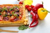 Pizza calzone na desce w serwetkę na drewnianym stole