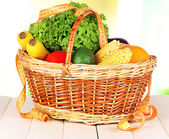 świeże warzywa w kosz na drewnianym stole na naturalne tło