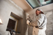 Zdjęcie "Workman tynkowania ścian gipsowych wewnątrz domu." może być wykorzystywane do celów osobistych i komercyjnych zgodnie z warunkami zakupionej licencji Royalty-free. Obraz jest dostępny do pobrania w jakości wysokiej rozdzielczości do 5760x3840.