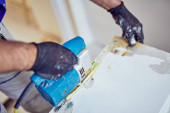 Zdjęcie "Workman tynkowania ścian gipsowych wewnątrz domu." może być wykorzystywane do celów osobistych i komercyjnych zgodnie z warunkami zakupionej licencji Royalty-free. Obraz jest dostępny do pobrania w jakości wysokiej rozdzielczości do 5760x3840.