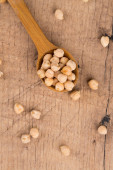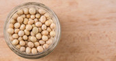 Surowe ciecierzyca lub Garbanzo fasoli (lat. Cicer arietinum) w słoiku, sfotografowane napowietrznych na drewno rustykalne (selektywne Focus, skupić się na górnej ciecierzycy)