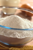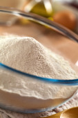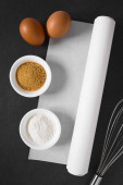 Przygotowanie ciasta drożdżowego do pieczenia chleba lub pizzy, sfotografowany narzut na łupku (selektywne Focus, skupić się na sfermentowanych drożdży w środku mąki)