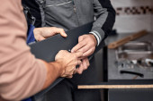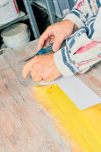Kobieta stolarz szlifowanie stare okno w warsztacie retro.