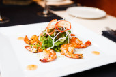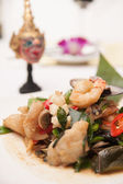 Tajski mieszać smażone owoce morza z zioło tajskie.