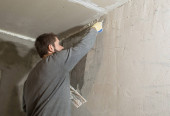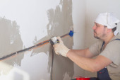 Worksman tynkowania ścian gipsowych wewnątrz domu.