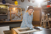 Zdjęcie "Kobieta stolarz szlifowanie stare okno w warsztacie retro." może być wykorzystywane do celów osobistych i komercyjnych zgodnie z warunkami zakupionej licencji Royalty-free. Obraz jest dostępny do pobrania w jakości wysokiej rozdzielczości do 5760x3840.