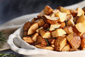 rozmaryn zioło ziemniaki w białe naczynia do pieczenia z bliska.