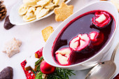 Zdjęcie "Barszcz (zupa buraczana) z małymi pierogami" może być wykorzystywane do celów osobistych i komercyjnych zgodnie z warunkami zakupionej licencji Royalty-free. Obraz jest dostępny do pobrania w jakości wysokiej rozdzielczości do 5760x3840.
