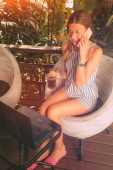 Kobieta za pomocą laptopa, telefon komórkowy i picie kawy na porc domu
