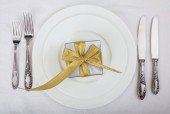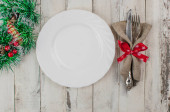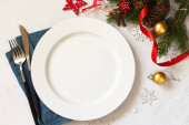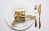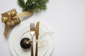 Ustawienie stołu, Boże Narodzenie, nowy rok. Złote sztućce na białym zestawie potraw, białe tło