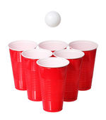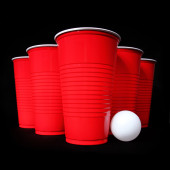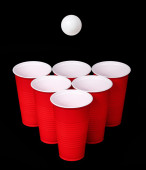 Beer pong. czerwone kubki plastikowe na czarnym tle