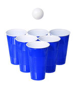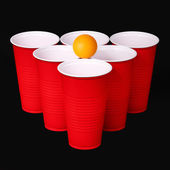 Beer pong. czerwone kubki plastikowe z ping pong piłkę i blondynka dziewczyny w seksowny top zbiornika. zbliżenie
