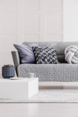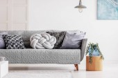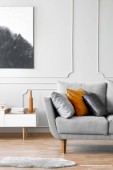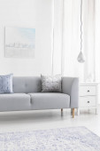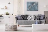 Abstrakcyjny niebieski obraz na pustej białej ścianie otwartego planu mieszkania