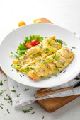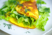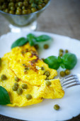 Smażony omlet z domowych jaj ze słodkim żółtym pieprzem w talerzu