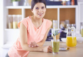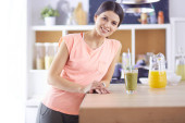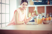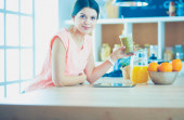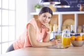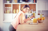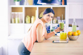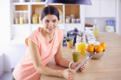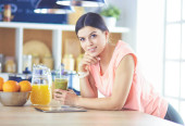 piękna młoda kobieta za pomocą tabletu cyfrowego w kuchni