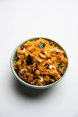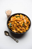 Zdjęcie "Płatki kukurydziane Chivda lub kukurydzy Chiwda załadowane orzeszków ziemnych i nerkowca. Służył w misce. ukierunkowanie selektywne" może być wykorzystywane do celów osobistych i komercyjnych zgodnie z warunkami zakupionej licencji Royalty-free. Obraz jest dostępny do pobrania w jakości wysokiej rozdzielczości do 5760x3840.