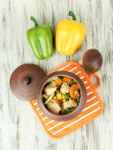 Zapiekanka z warzyw i mięsa, drewniany stół, na jasnym tle