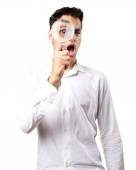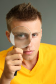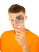 młody mężczyzna patrząc przez szkło powiększające, na białym tle
