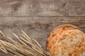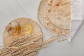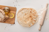 Widok z góry na płaski chleb Lavash w pobliżu kolców pszenicy, wałek do toczenia i oliwy z oliwek na białej powierzchni