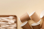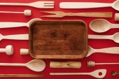 Widok z góry na naturalnym prostokątnym drewnianym naczyniu ze sztućcami na czerwonym tle z przyborami kuchennymi