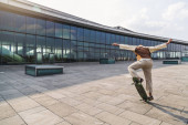 Afro Skater na świeżym powietrzu robi sztuczkę na białym