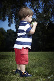 Młody chłopak gra w domu w pobliżu domu, w ogrodzie z różnych zabawek