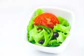 widelec, czarnych oliwek, sałata, pomidory, ogórki i papryka w misce