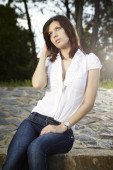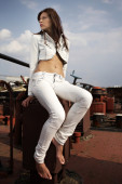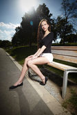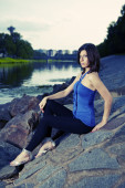 Slim lady nad rzeką pozowanie w pod koniec dnia światło