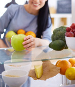 Uśmiechnięta kobieta wyciągająca świeże owoce z lodówki, koncepcja zdrowej żywności