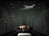 biznesmen siedząc gród rysunek na chalkbo