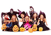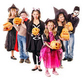 Halloween party z dzieci trzymając Cukierek albo psikus.