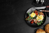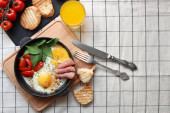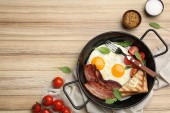 Zdjęcie "Smaczne śniadanie ze smażonym jajkiem serwowane na drewnianym stole, płaski lay. Miejsce na tekst" może być wykorzystywane do celów osobistych i komercyjnych zgodnie z warunkami zakupionej licencji Royalty-free. Obraz jest dostępny do pobrania w jakości wysokiej rozdzielczości do 5760x3840.