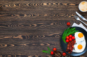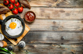 Smaczne śniadanie ze smażonym jajkiem serwowane na drewnianym stole, płaski lay. Miejsce na tekst