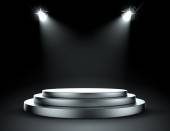 Okrągłe podium, cokot lub platforma oświetlona przez reflektory na szarym tle. Scena z malowniczymi światłami. Ilustracja wektorowa.