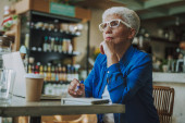 Zdjęcie "Przemyślany kobieta siedzi z filiżanką kawy Zdjęcie stockowe" może być wykorzystywane do celów osobistych i komercyjnych zgodnie z warunkami zakupionej licencji Royalty-free. Obraz jest dostępny do pobrania w jakości wysokiej rozdzielczości do 5760x3840.