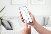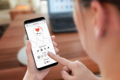 Pomiar tętna, uderzeń na minutę aplikacji na nowoczesnym smartfonie na koncepcji biurka biurowego.