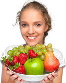 Młoda kobieta uśmiechnięta trzyma miskę ze świeżych owoców, zdrowy styl życia