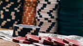 Kijów, Ukraina - 20 sierpnia 2019: panoramiczne ujęcie człowieka korzystającego z laptopa w pobliżu żetonów pokerowych odizolowanych na czarno