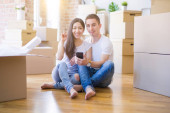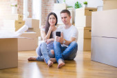 Piękna para siedząca na podłodze trzymająca smartfona w nowym domu wokół kartonowych pudełek z gniewną twarzą, negatywny znak pokazujący niechęć z opuszczonymi kciukami, koncepcja odrzucenia