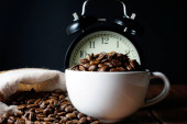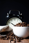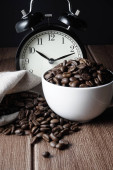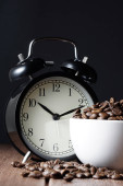 Biała filiżanka kawy i brązowy Palone ziarna kawy na stole ze starym budzikiem