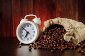 Biała filiżanka do kawy i brązowy Palone ziarna kawy na stole z juta serwetki i stary budzik