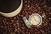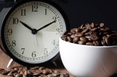 Biała filiżanka do kawy i brązowy Palone ziarna kawy na stole z juta serwetki i stary budzik