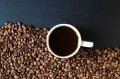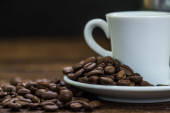Biała filiżanka kawy i brązowy Palone ziarna kawy na stole