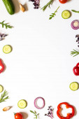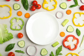 Rama wykonana ze świeżych składników sałatkowych na białym drewnianym stole, płaski lay. Miejsce na tekst
