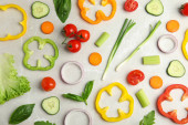 Zdjęcie "Rama wykonana ze świeżych składników sałatkowych na białym drewnianym stole, płaski lay. Miejsce na tekst" może być wykorzystywane do celów osobistych i komercyjnych zgodnie z warunkami zakupionej licencji Royalty-free. Obraz jest dostępny do pobrania w jakości wysokiej rozdzielczości do 5760x3840.