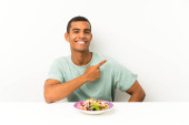 Młody przystojny człowiek z sałatką w tabeli pokazując OK znak palcami