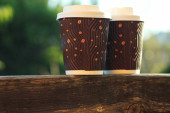 Dwie kawy, aby przejść na drewnianym balkonie. Koncepcja stylu życia.