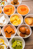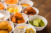 Rangoli z różnych indyjskich słodyczy/Mithai w misce dla Diziego lub innych festiwalach, selektywne skupienie